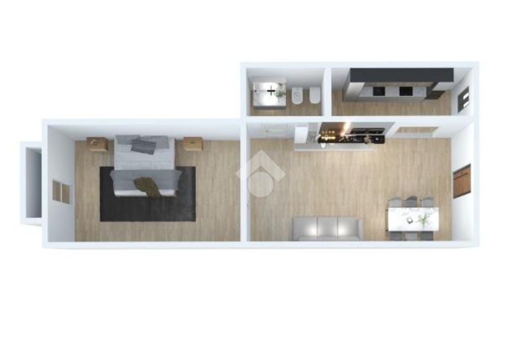 L’appartamento presenta una funzionale distribuzione degli spazi. L’ingresso ci conduce in un’accogliente stanza da pranzo che funge da ambiente centrale, con accesso ad una camera da letto con balcone. A seguire troviamo una pratica cucina e un bagno.